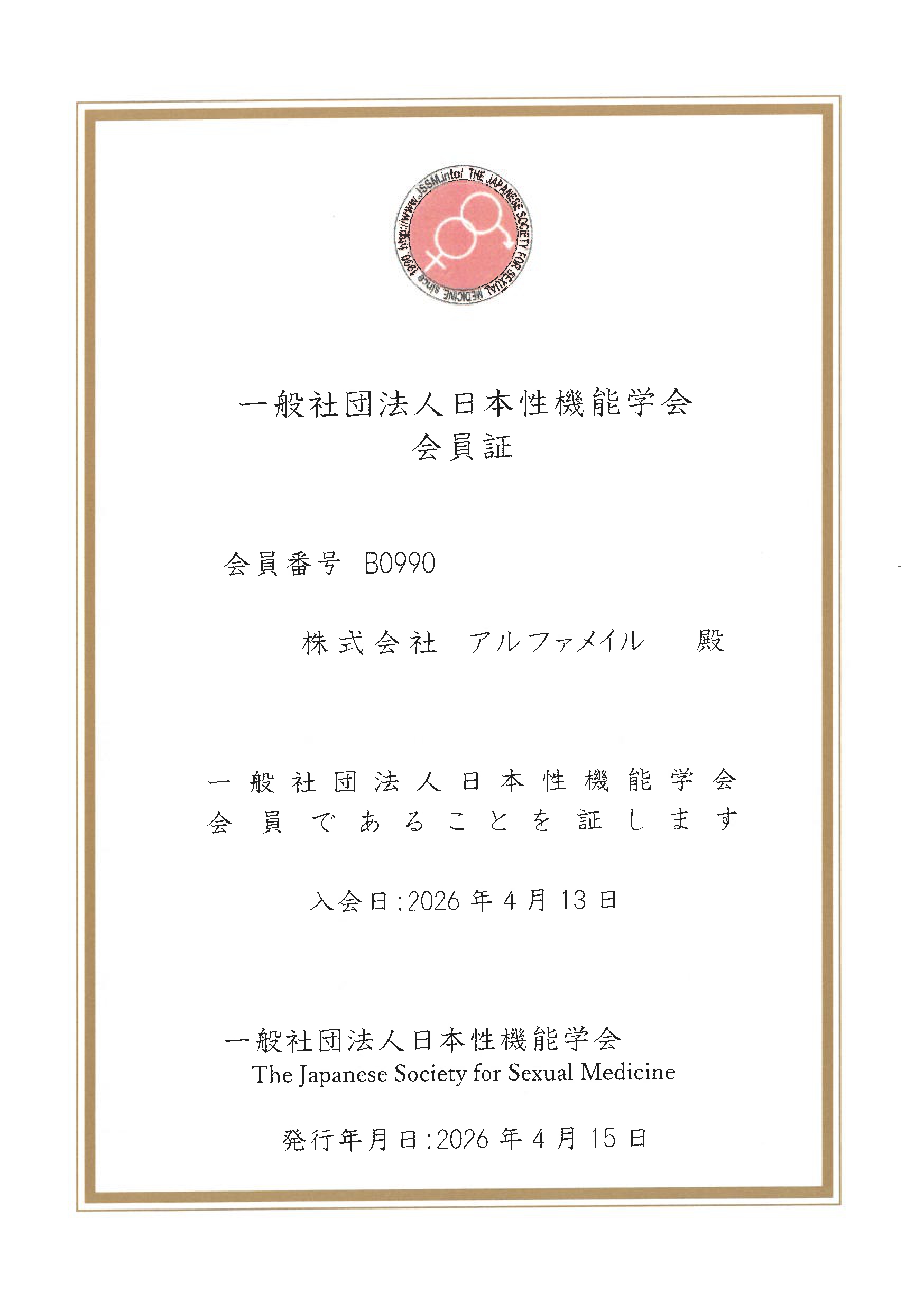 日本性機能学会に所属している企業として最新の知見を取り入れることは、株式会社アルファメイルが目指す「日本人男性のQoL向上」という目的達成の一助になると確信しております。